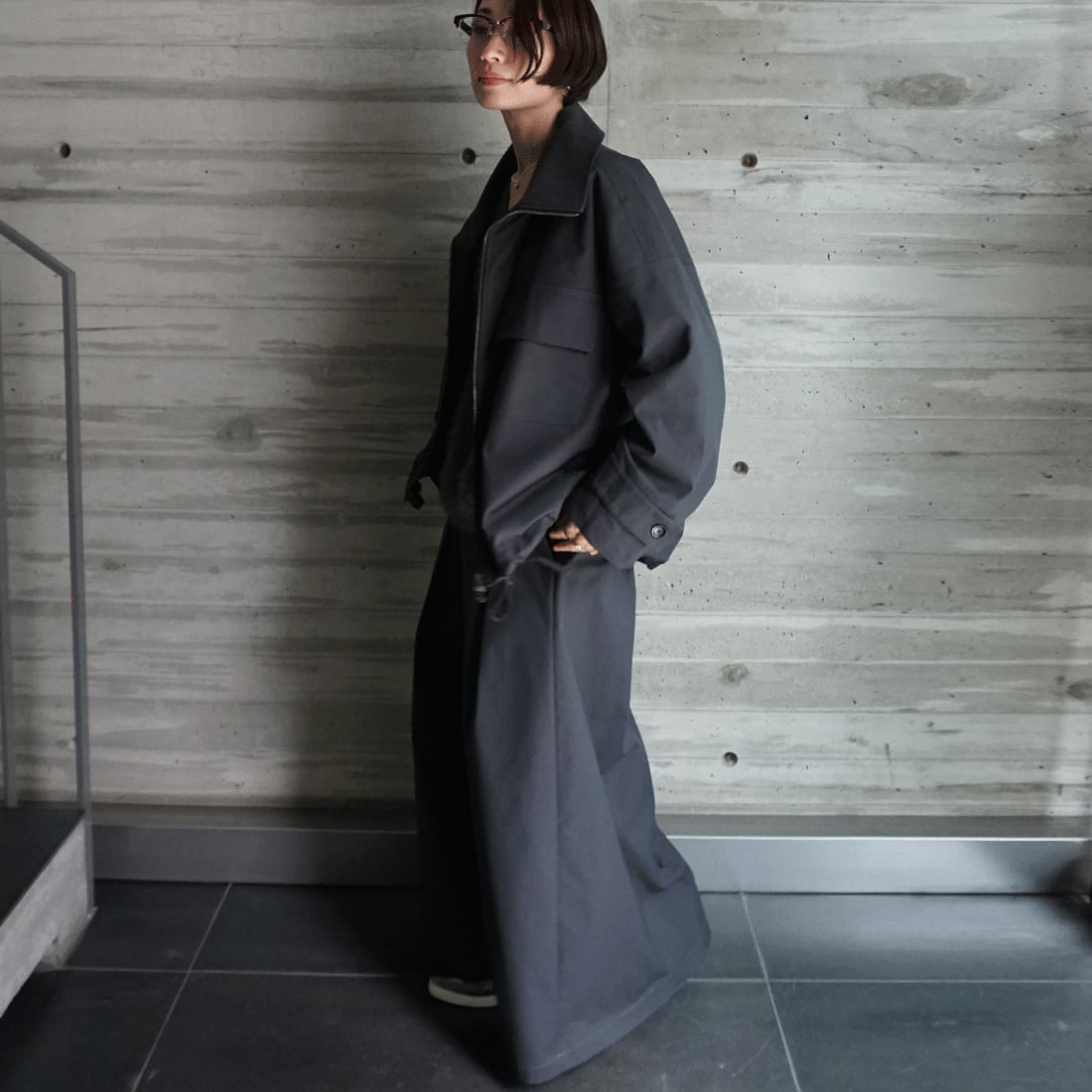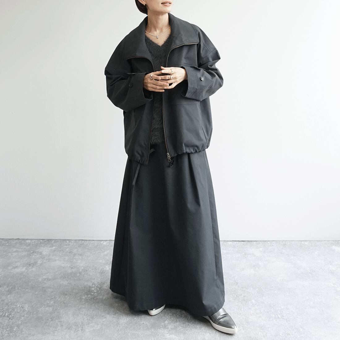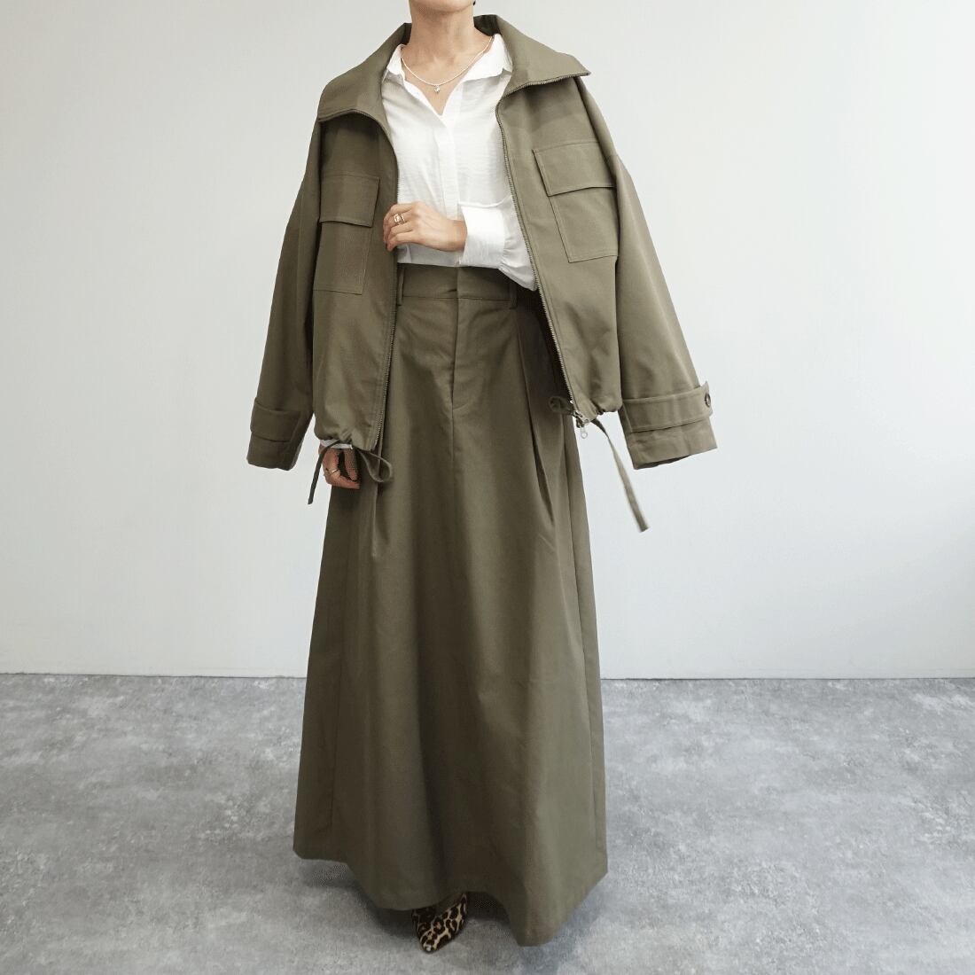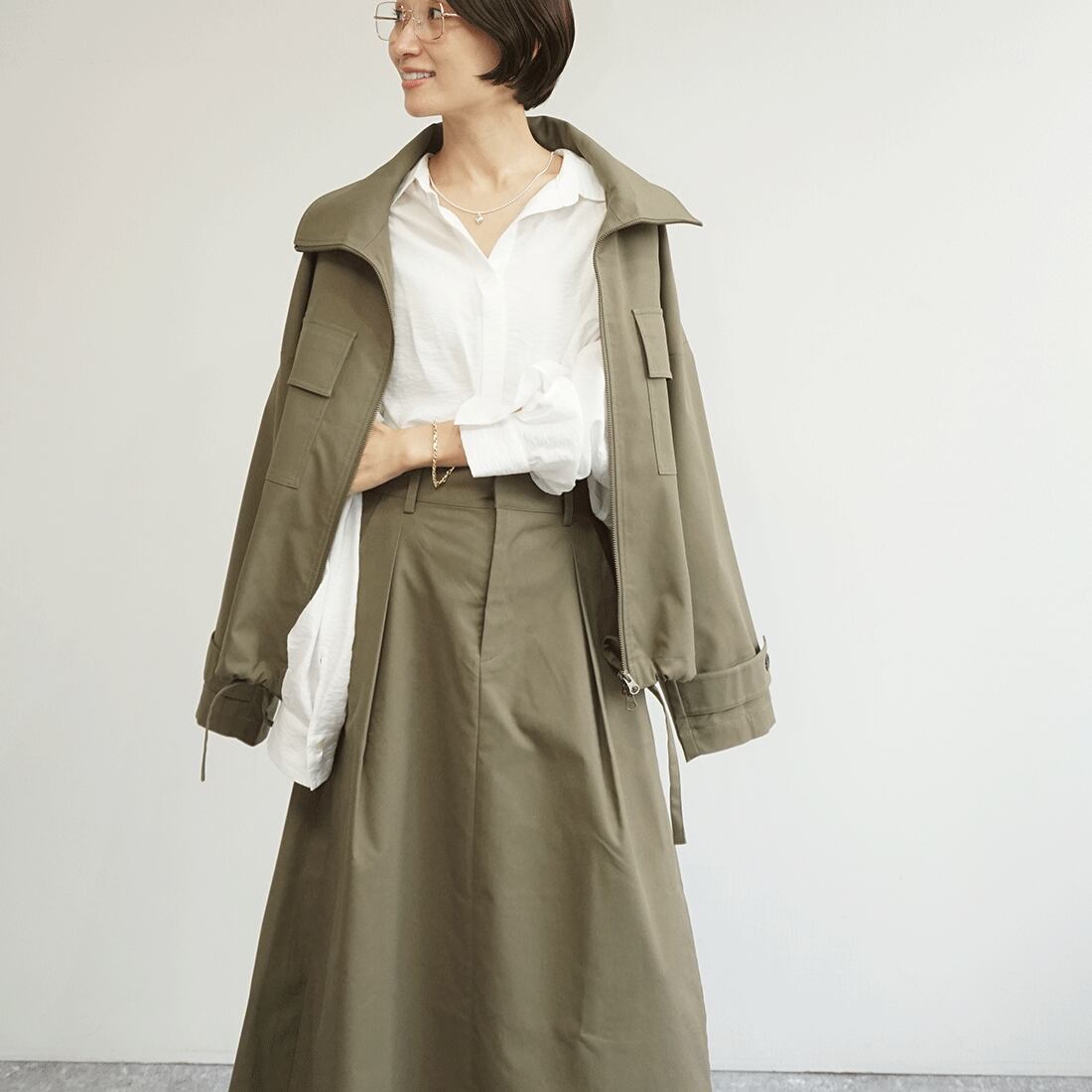 同素材のトレンチブルゾンと合わせ