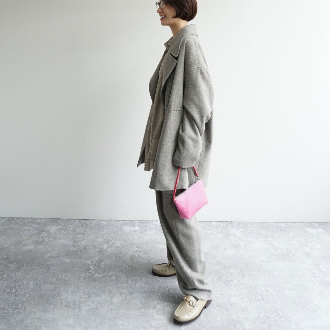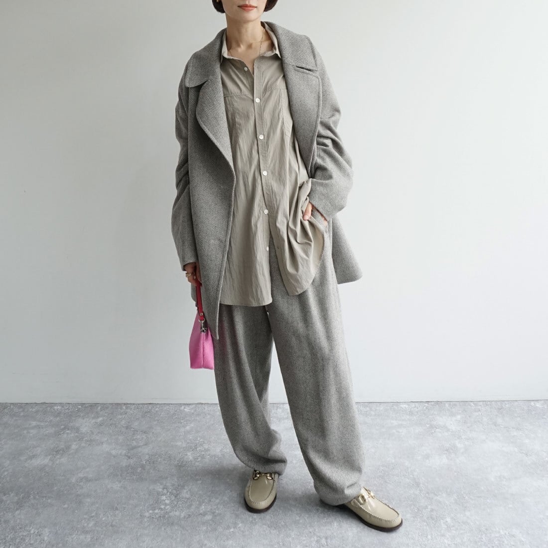 同素材パンツとのセットアップもおすすめです。