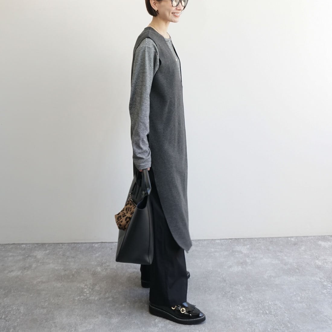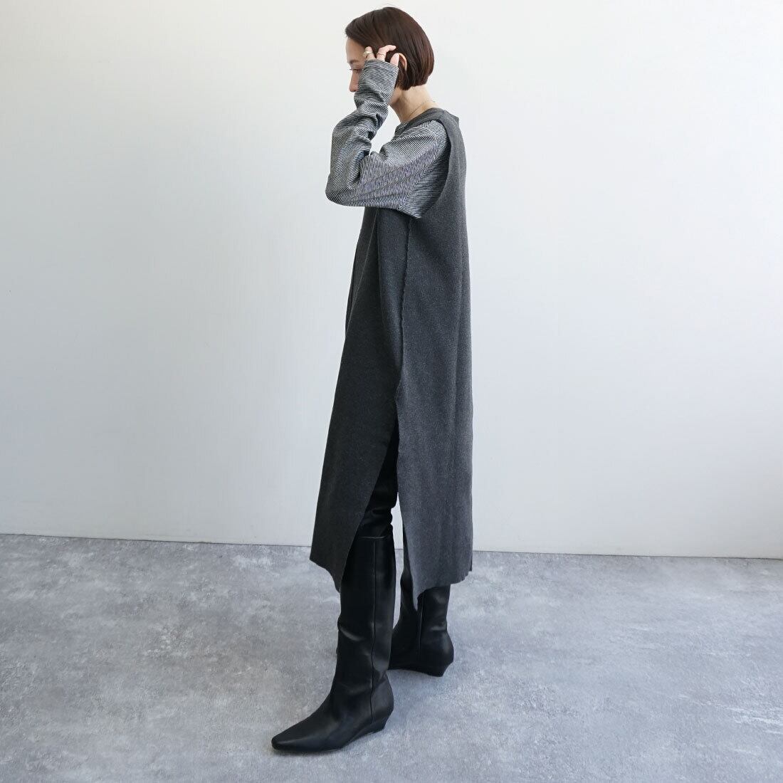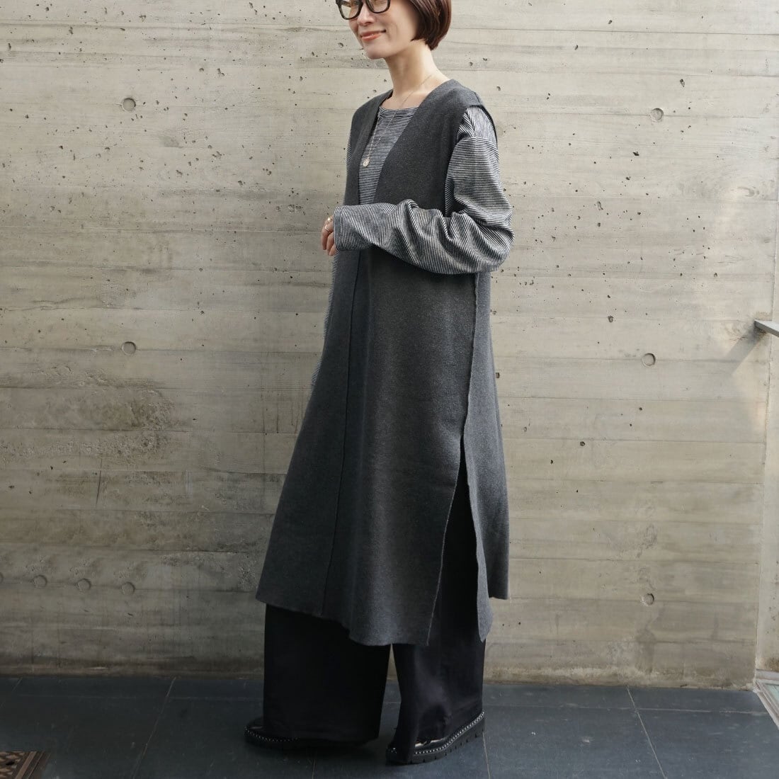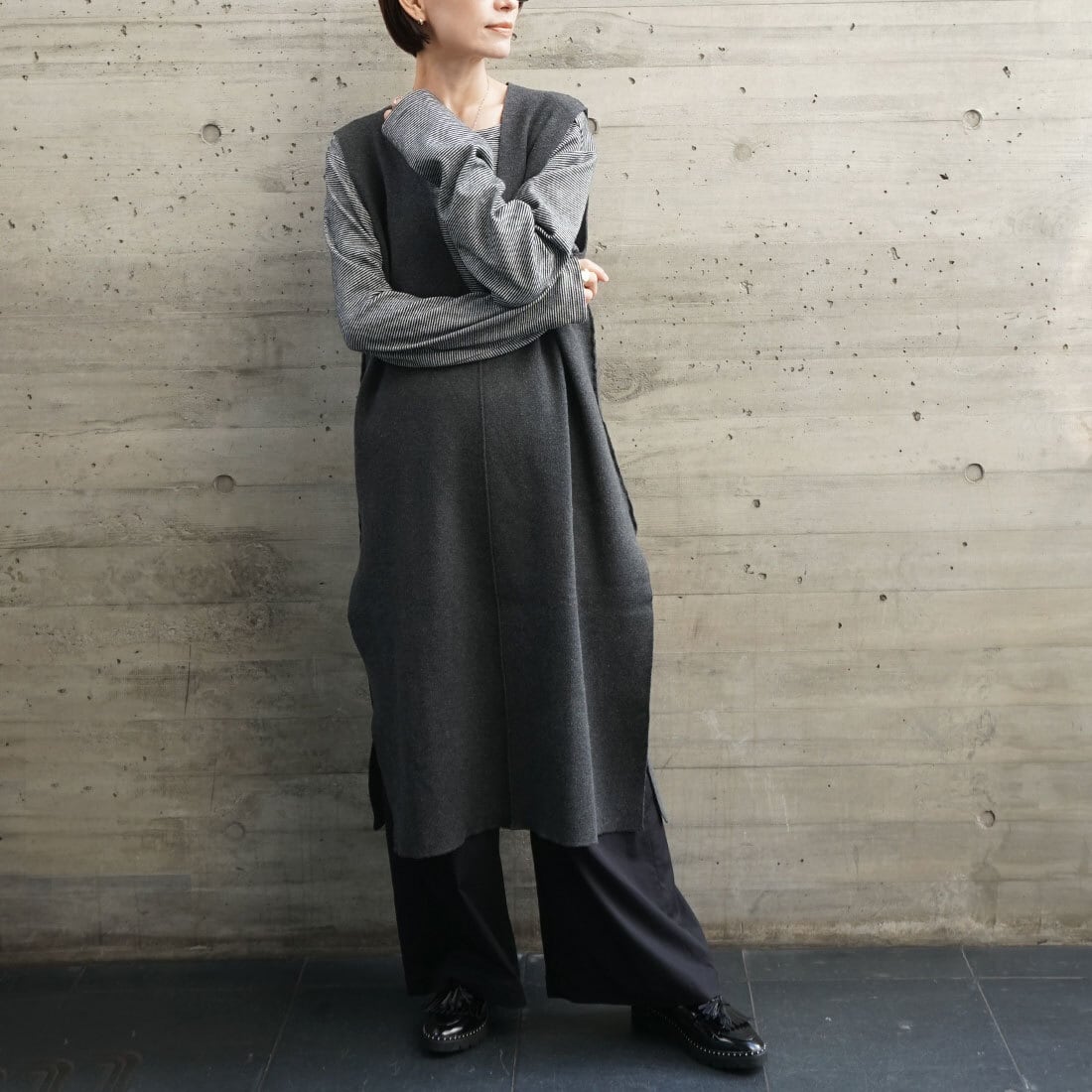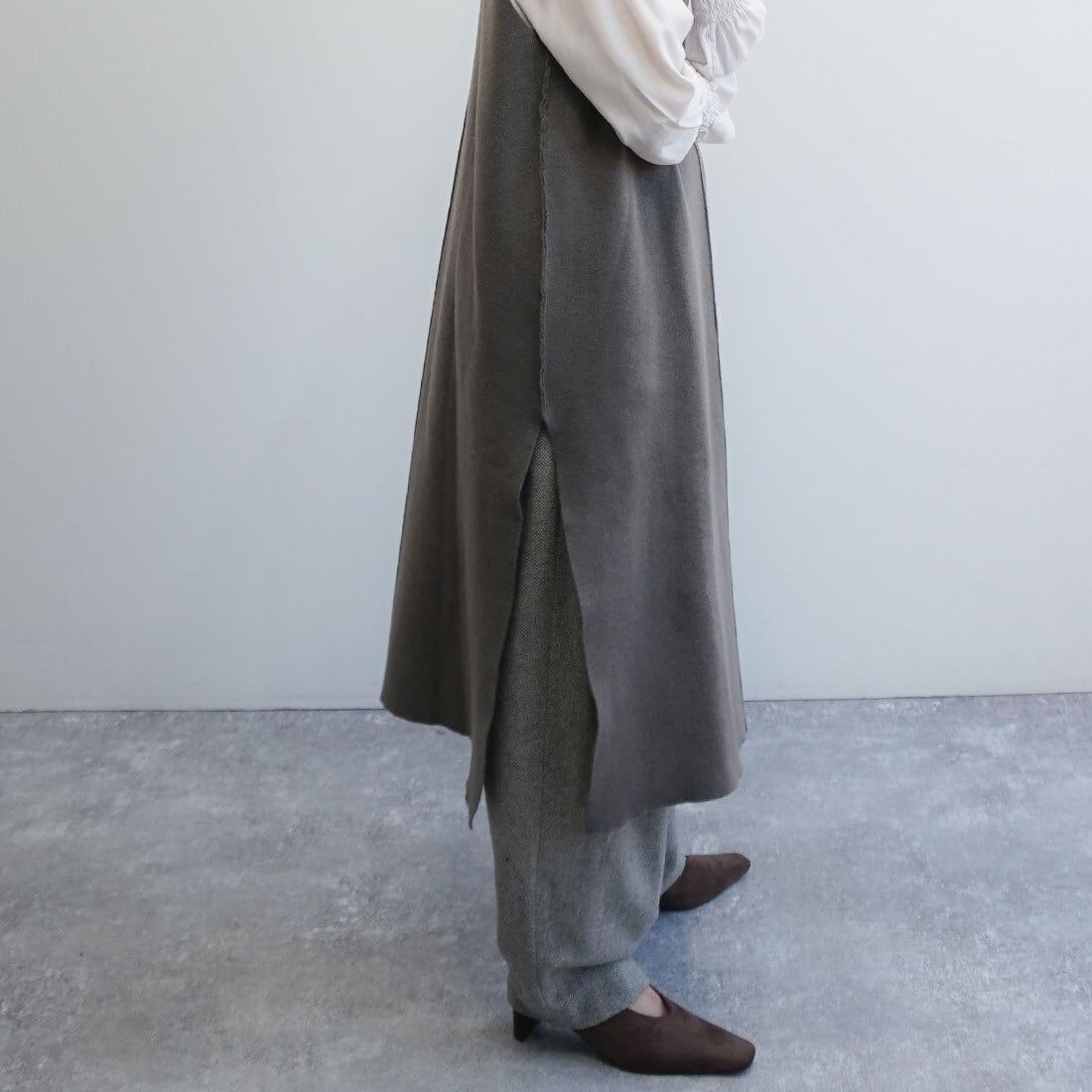 深めのサイドスリットが抜け感を