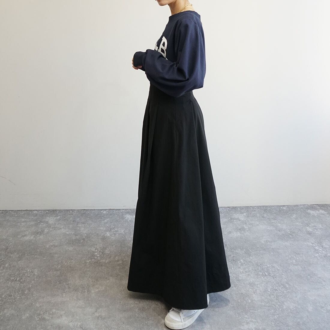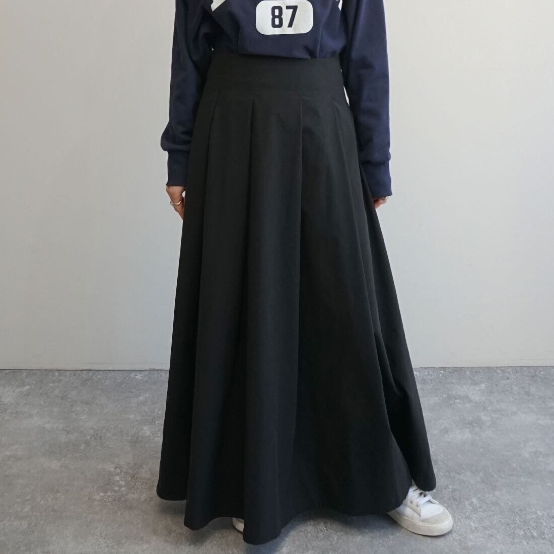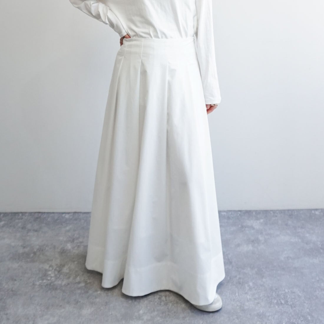 腰まわりをすっきり見せたタックマキシスカート。