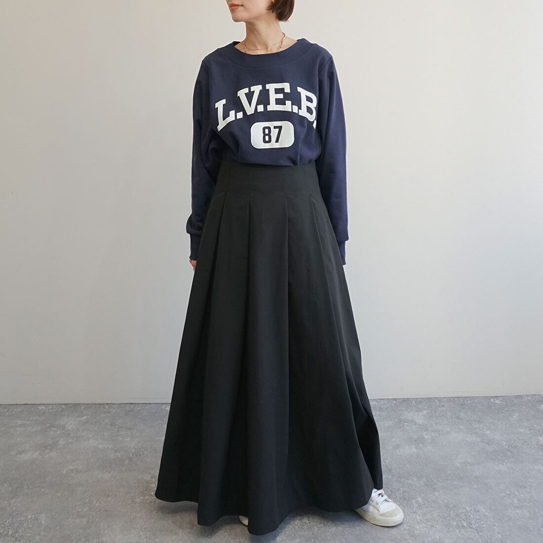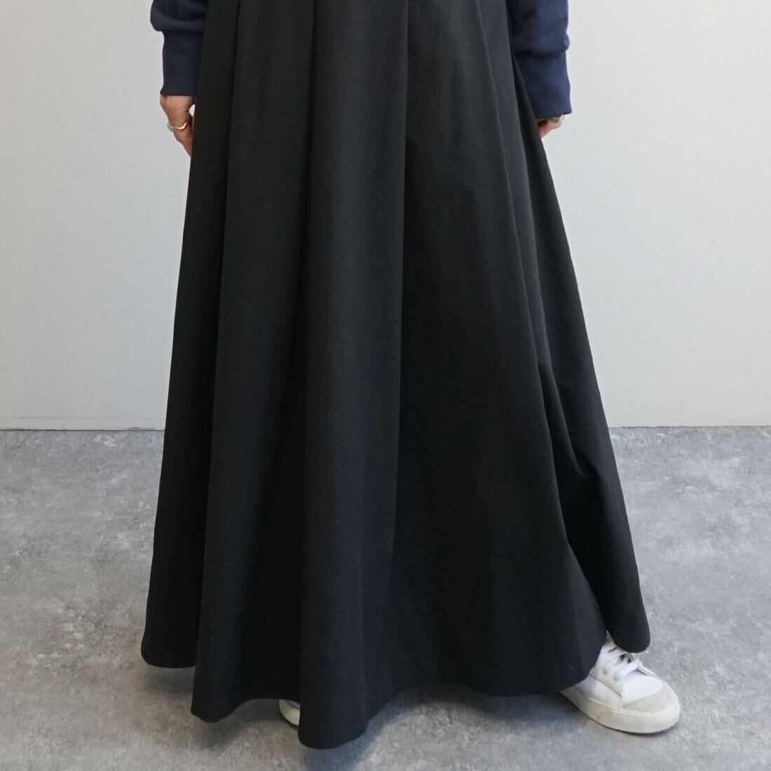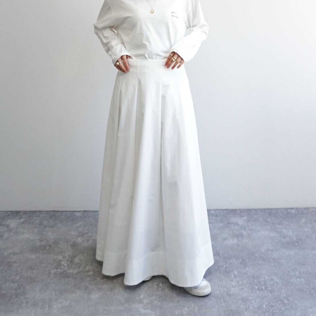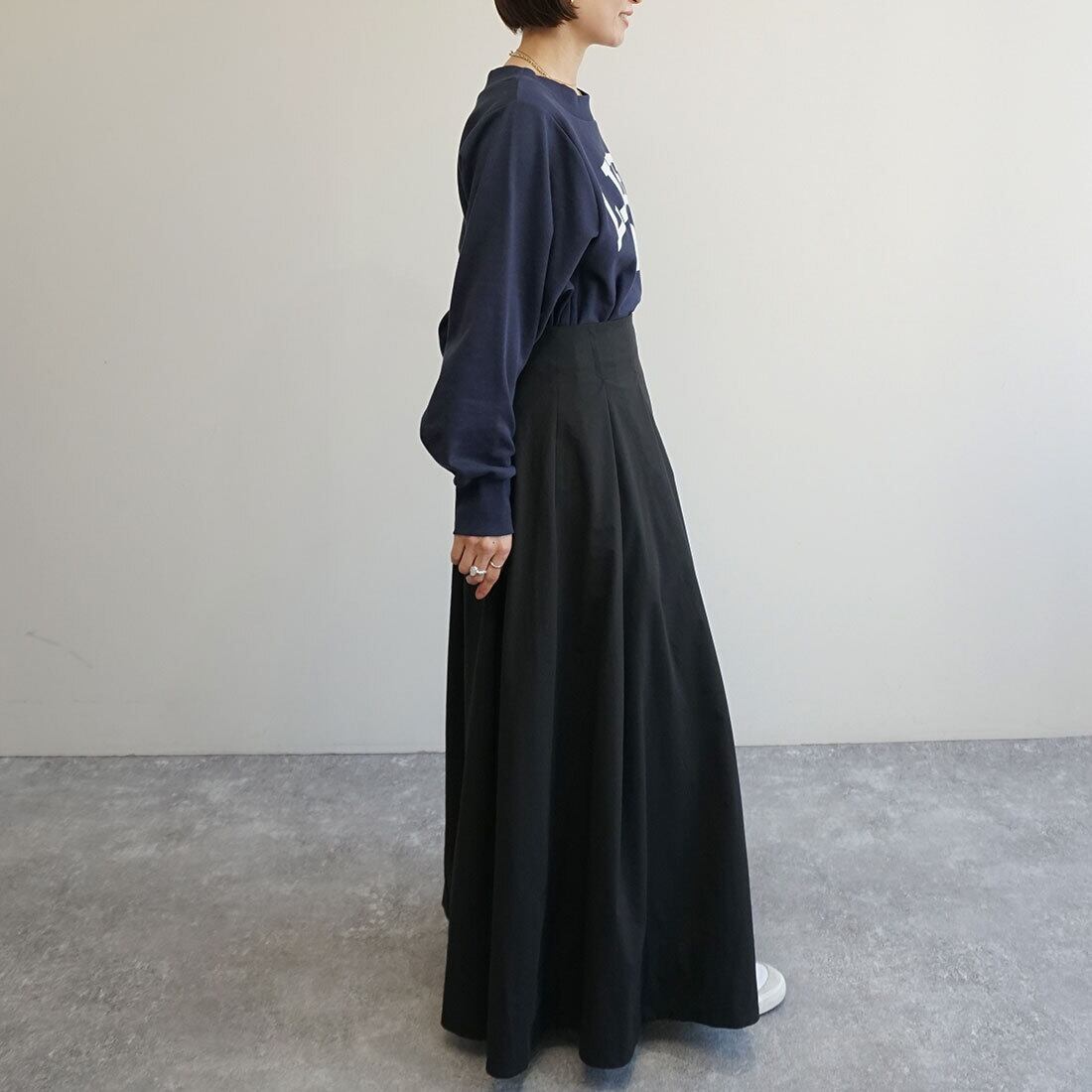 腰まわりをすっきり見せたタックマキシスカート。
