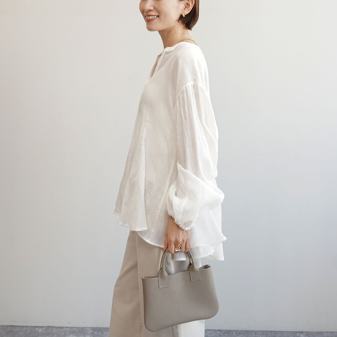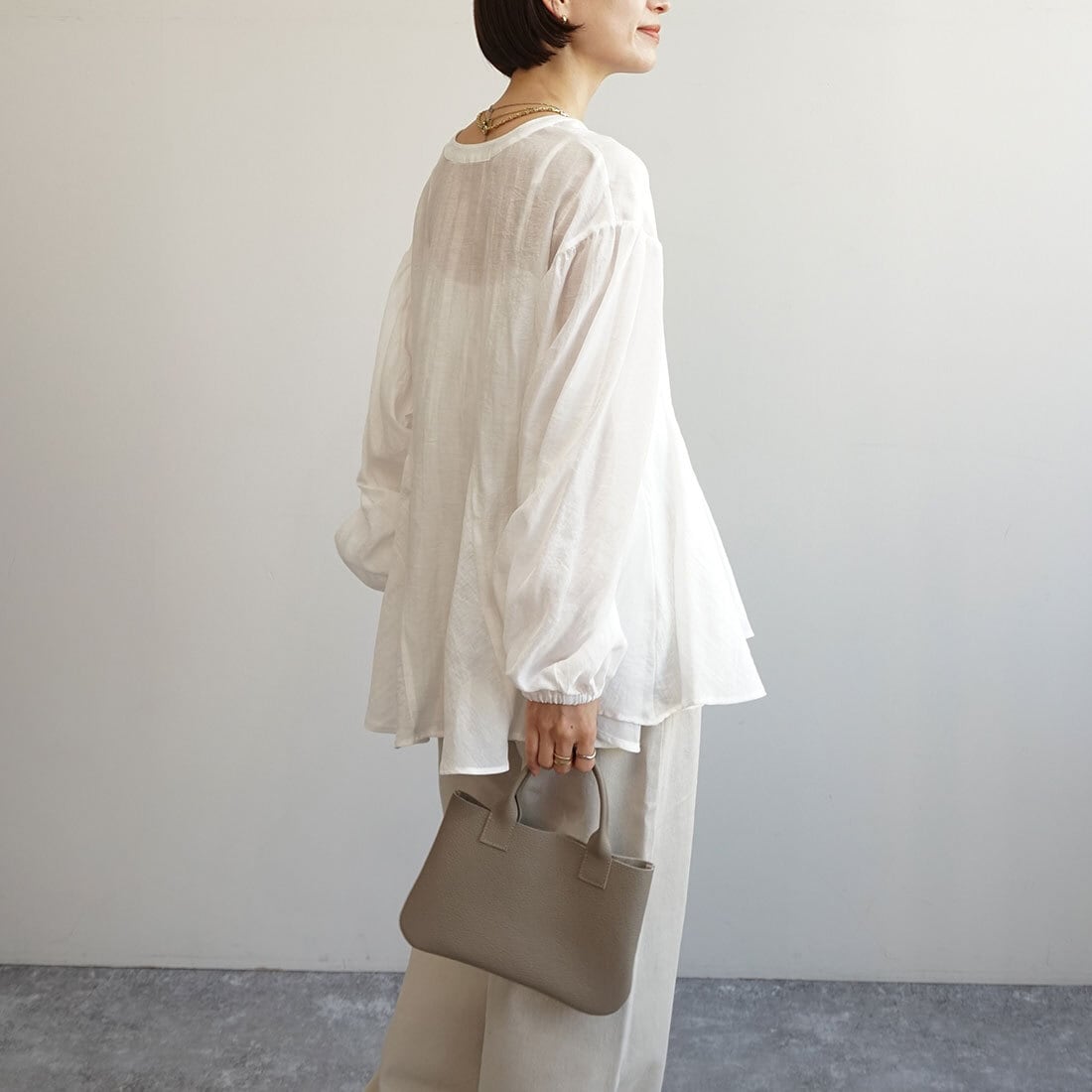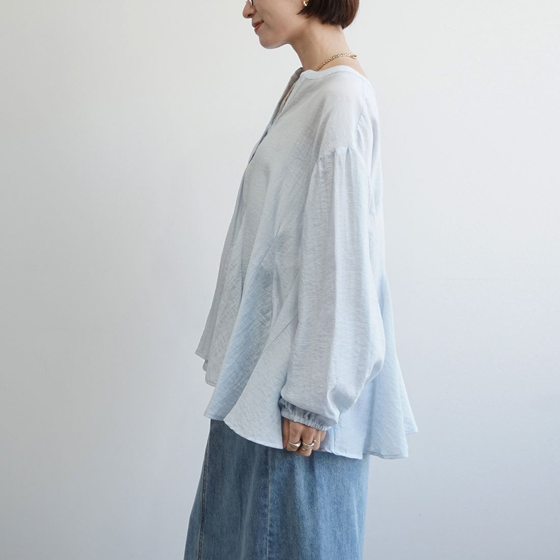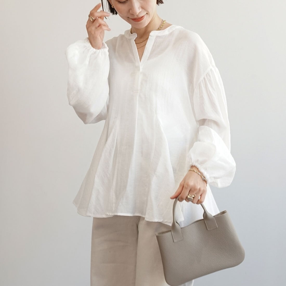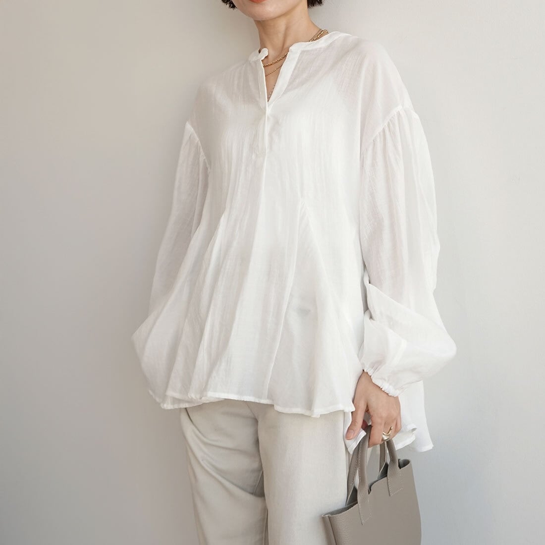 装いにやさしい抜けをつくるブラウスです。