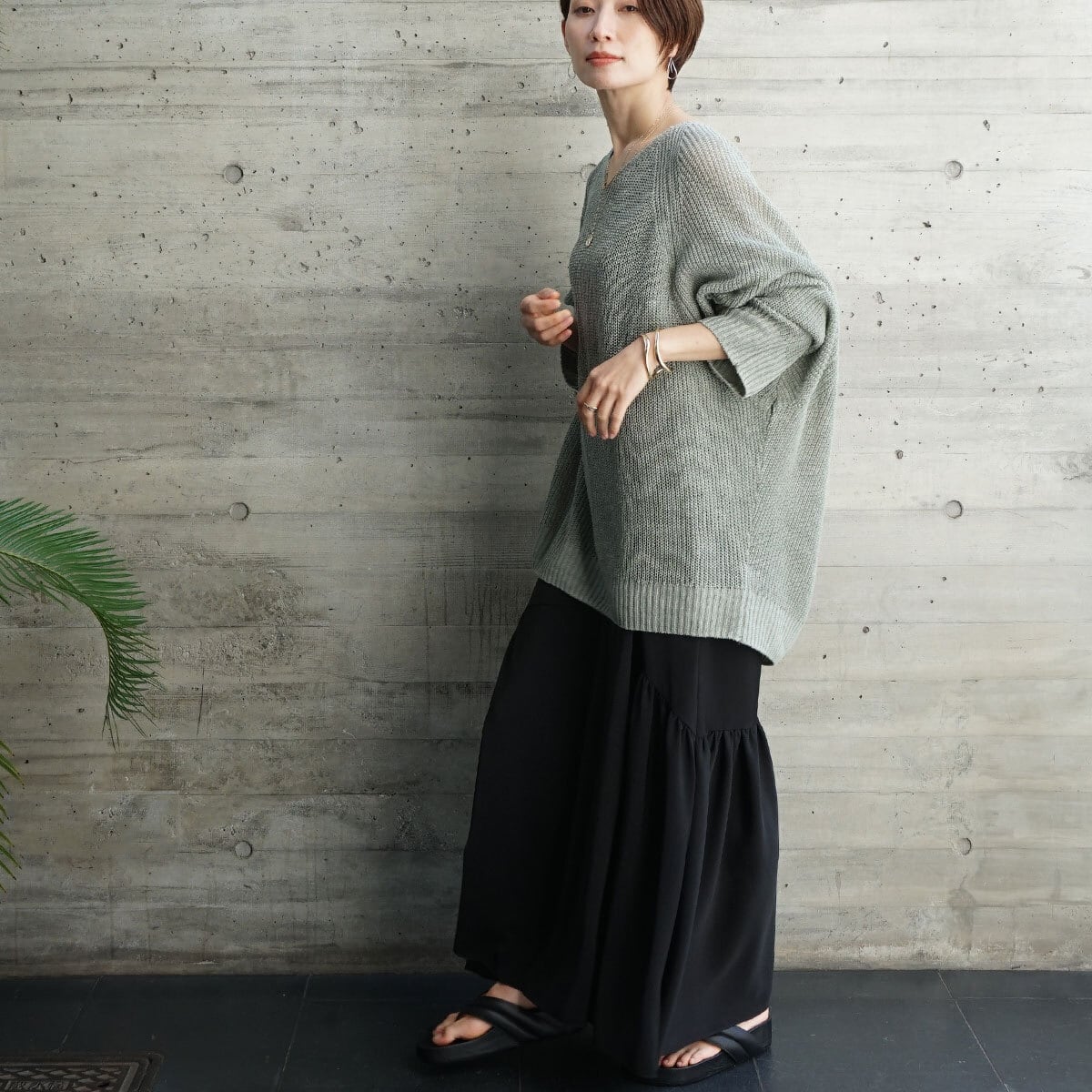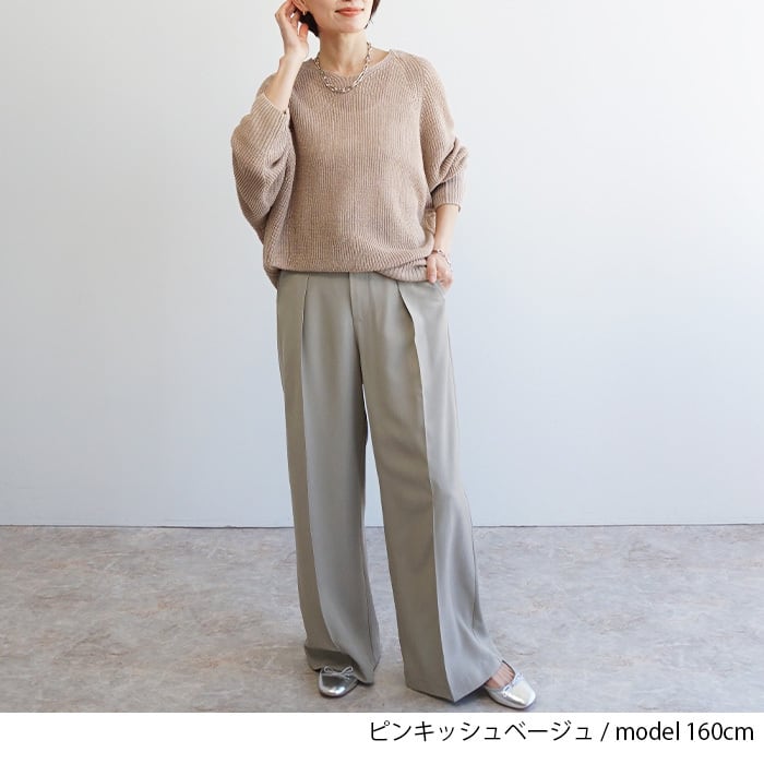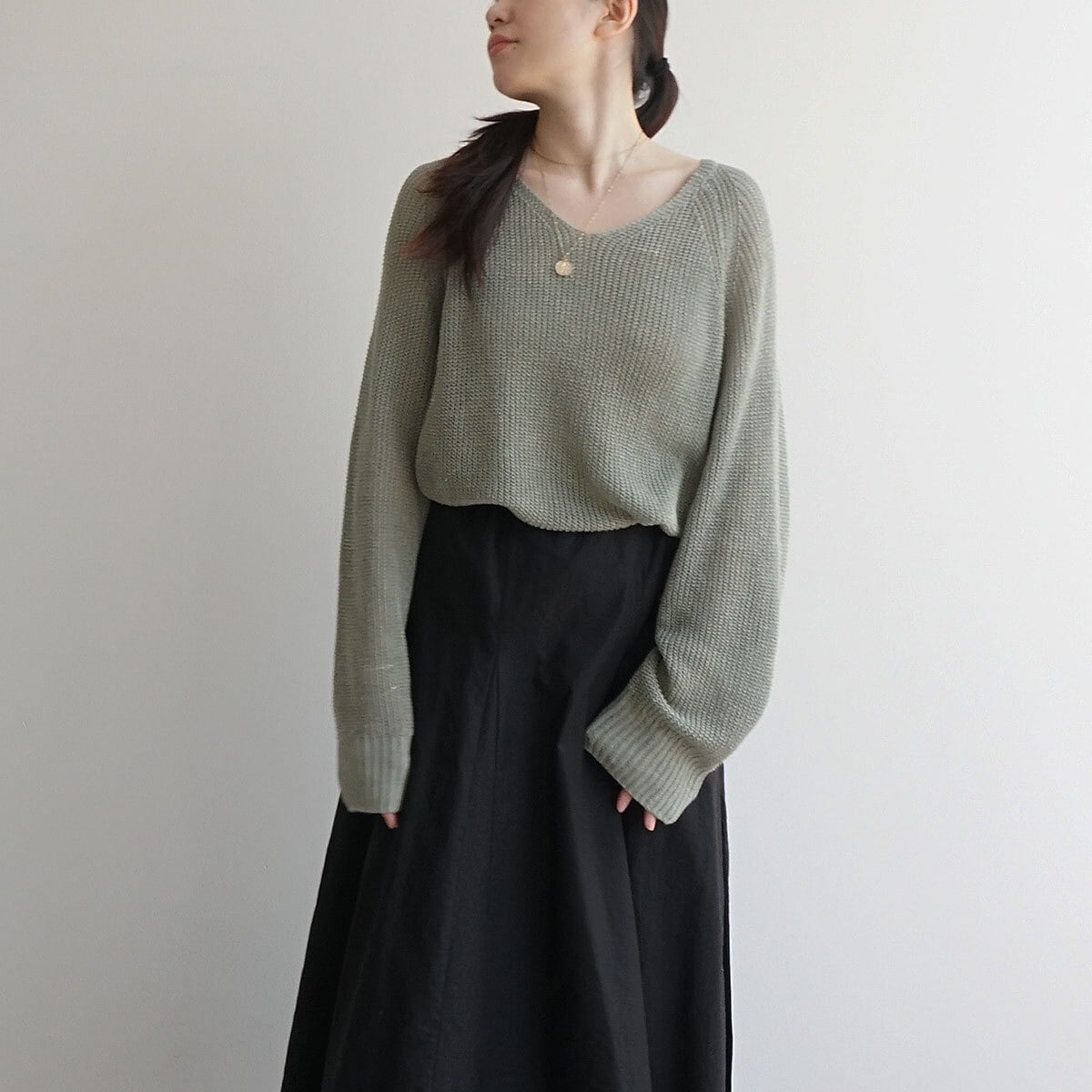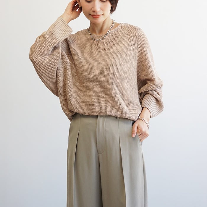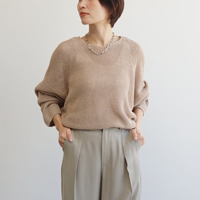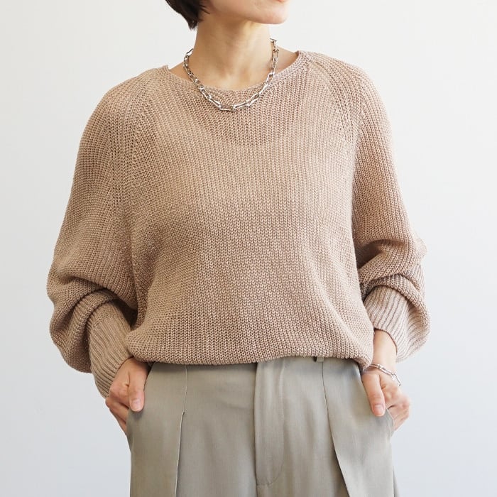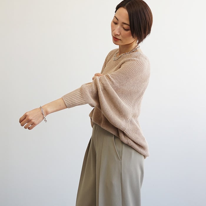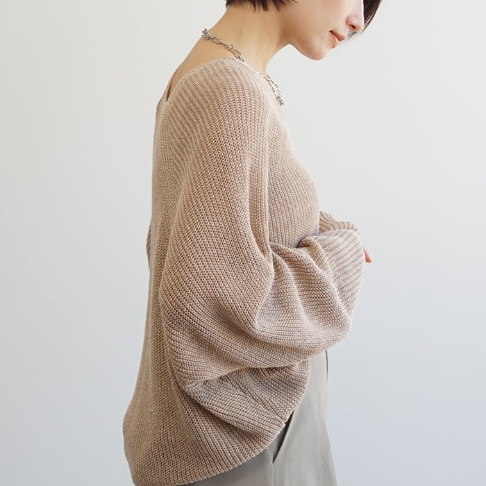 「麻100%ボリュームスリーブV片畦ニット」