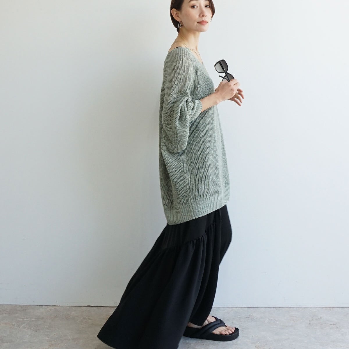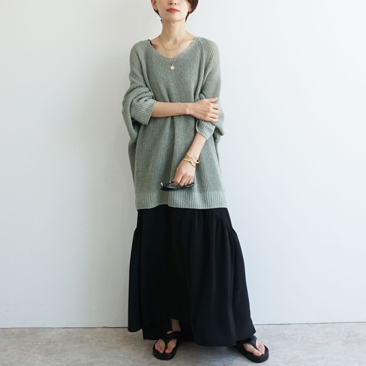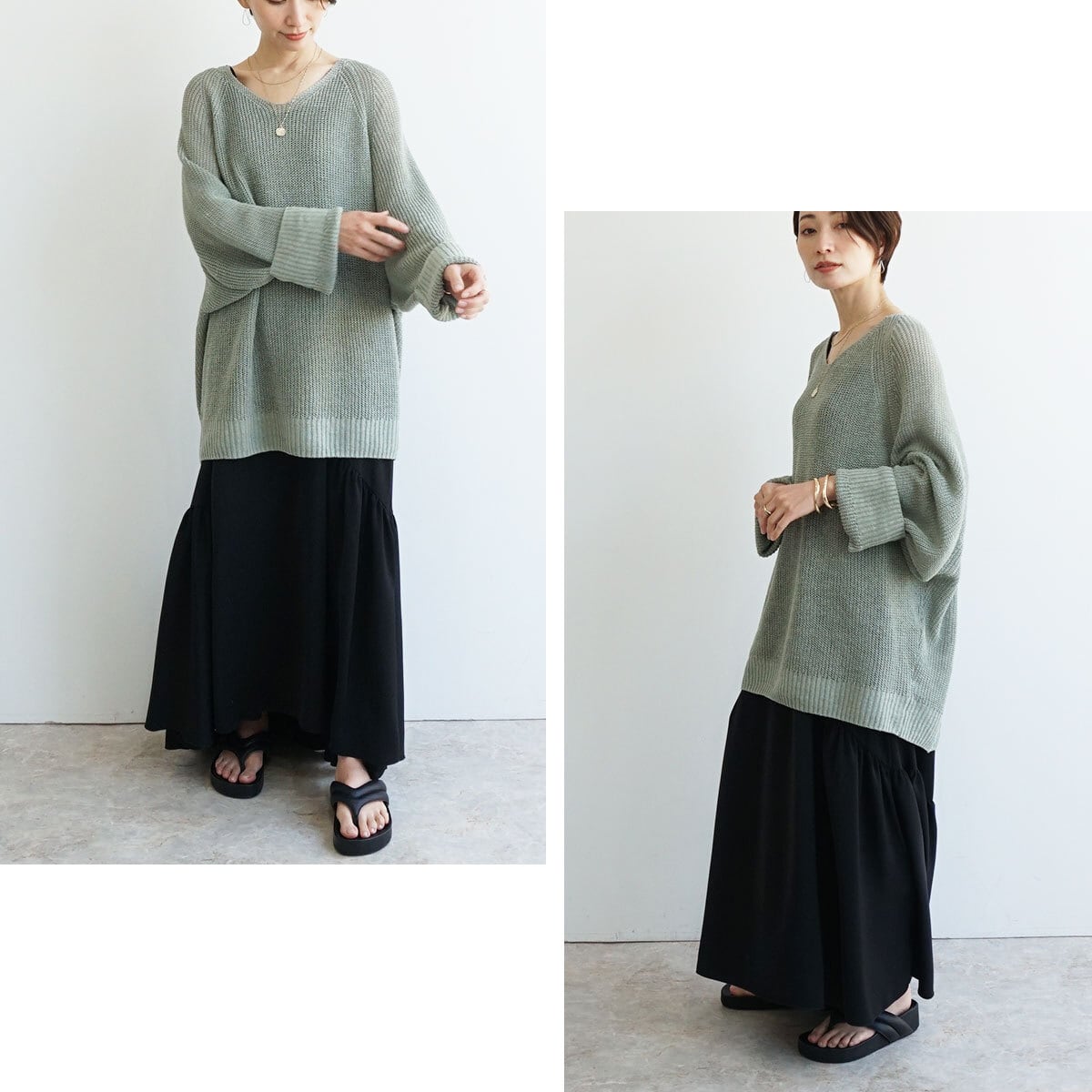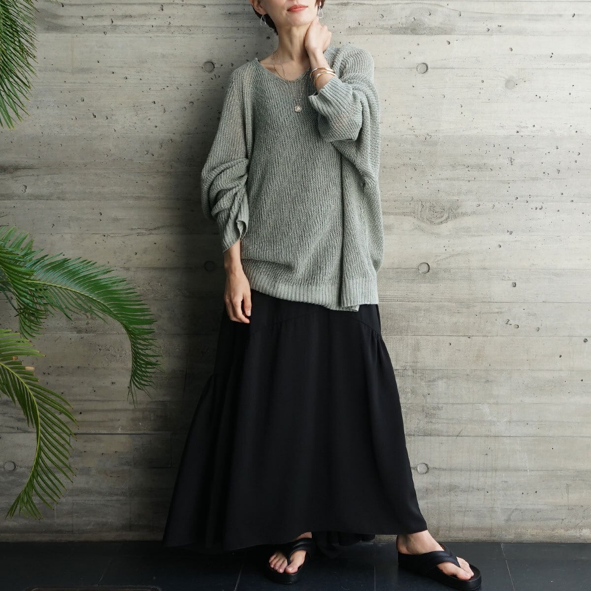 「麻100%ボリュームスリーブV片畦ニット」