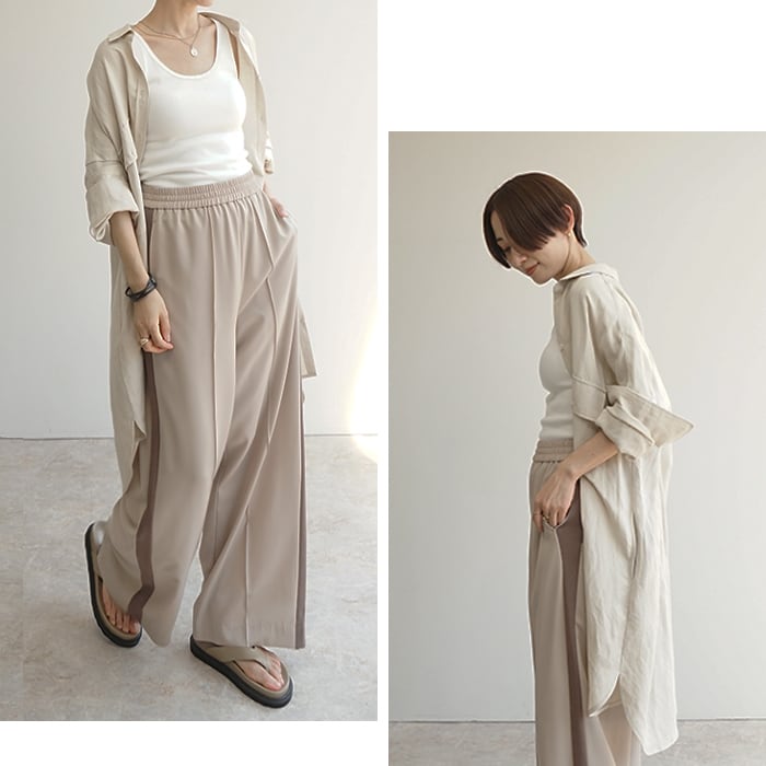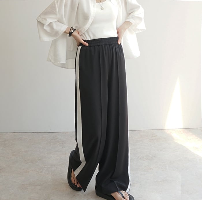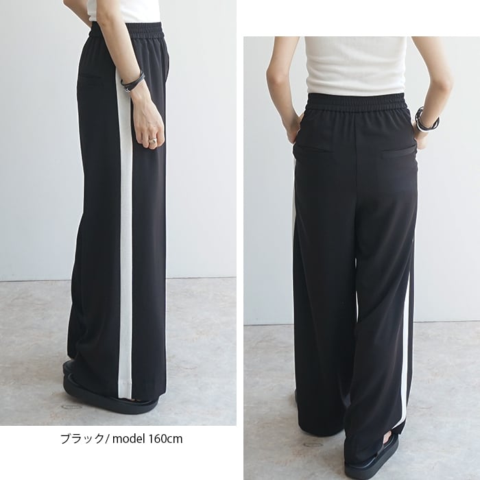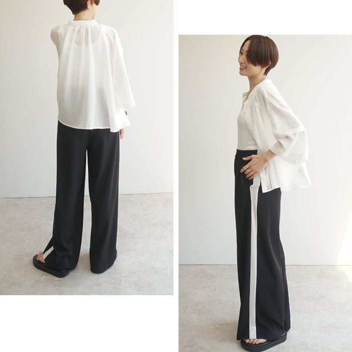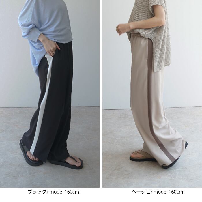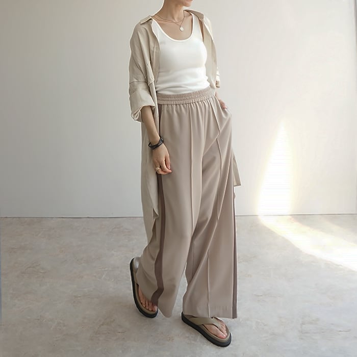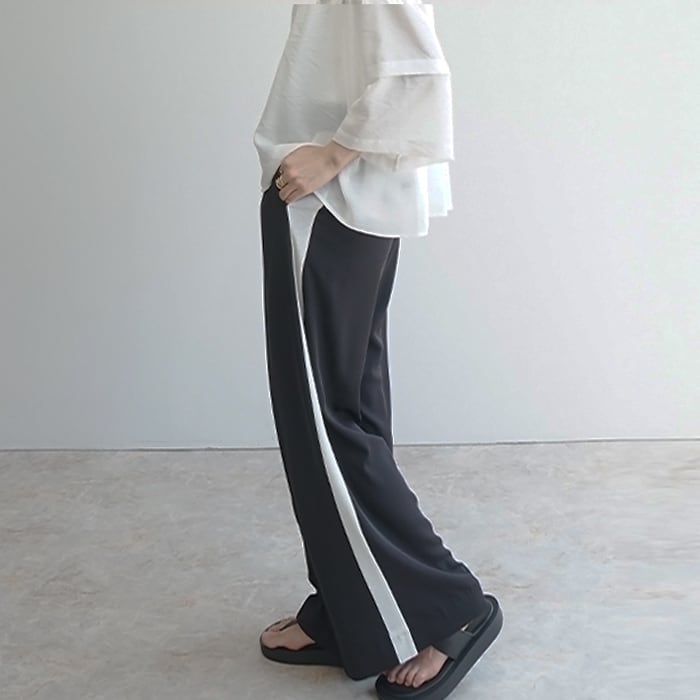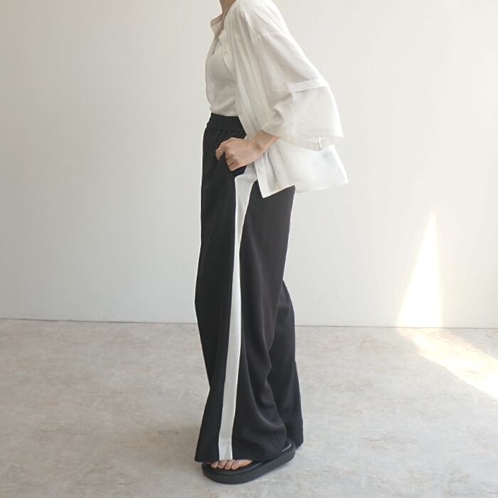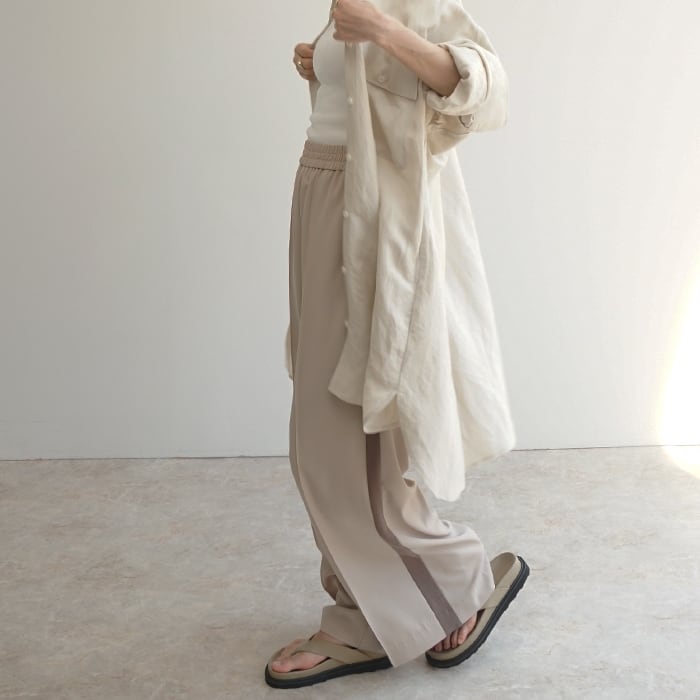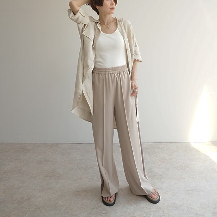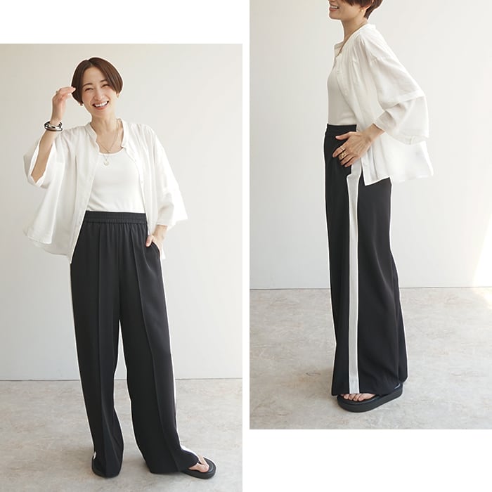 カジュアルになりやすいトラックパンツを弱光沢感のある