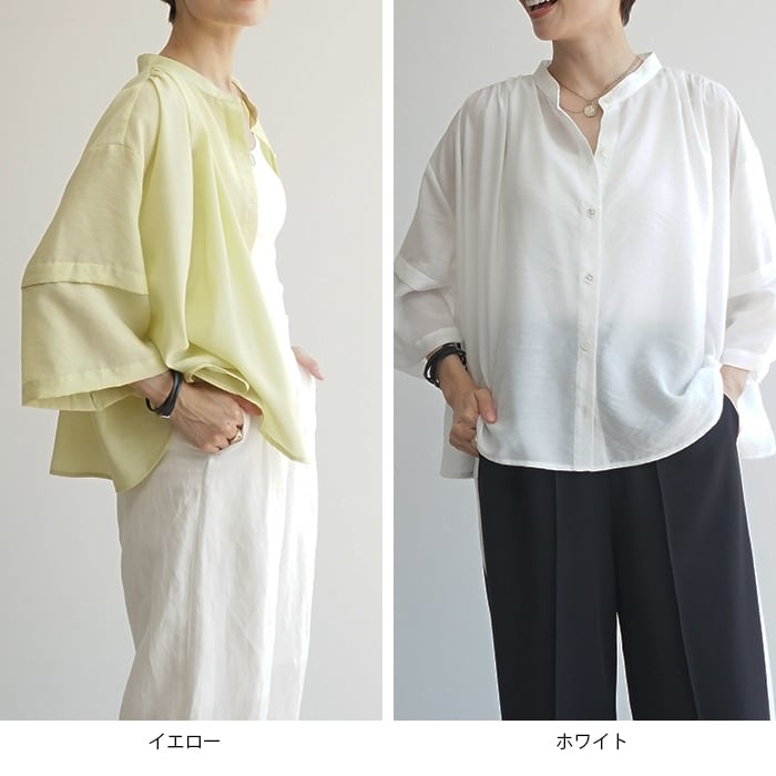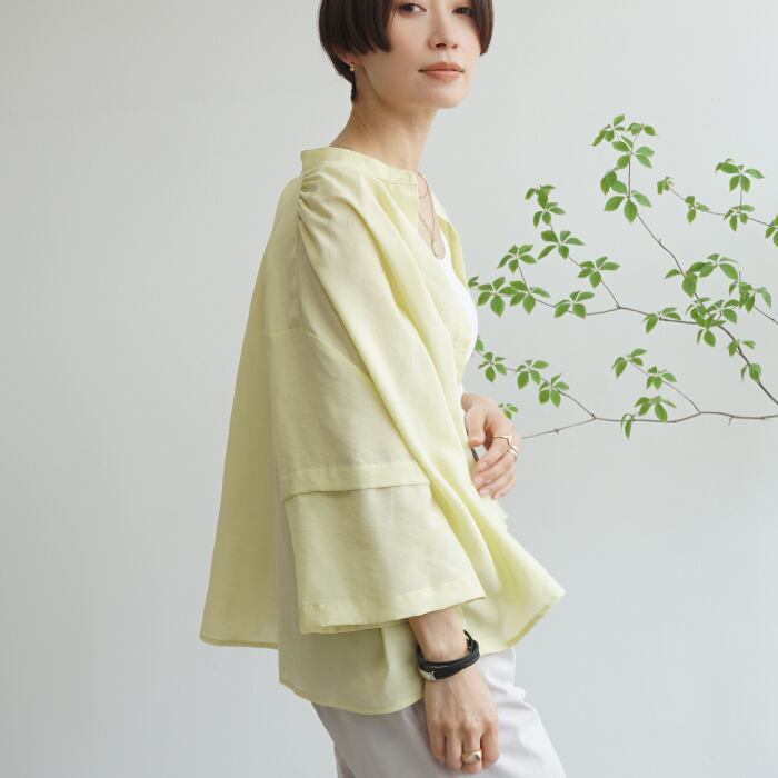 切り替えの入ったボリュームスリーブが一枚で着映えるデザイン